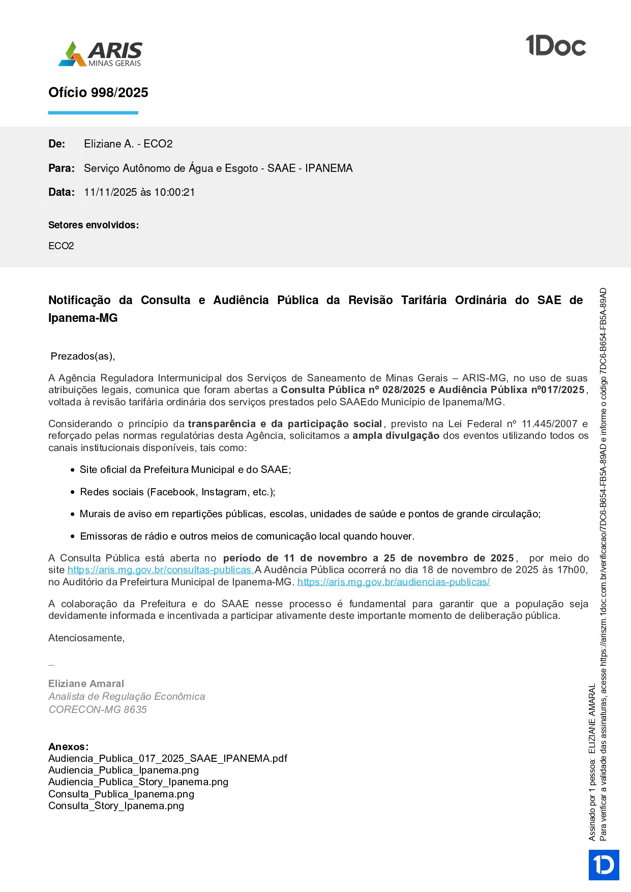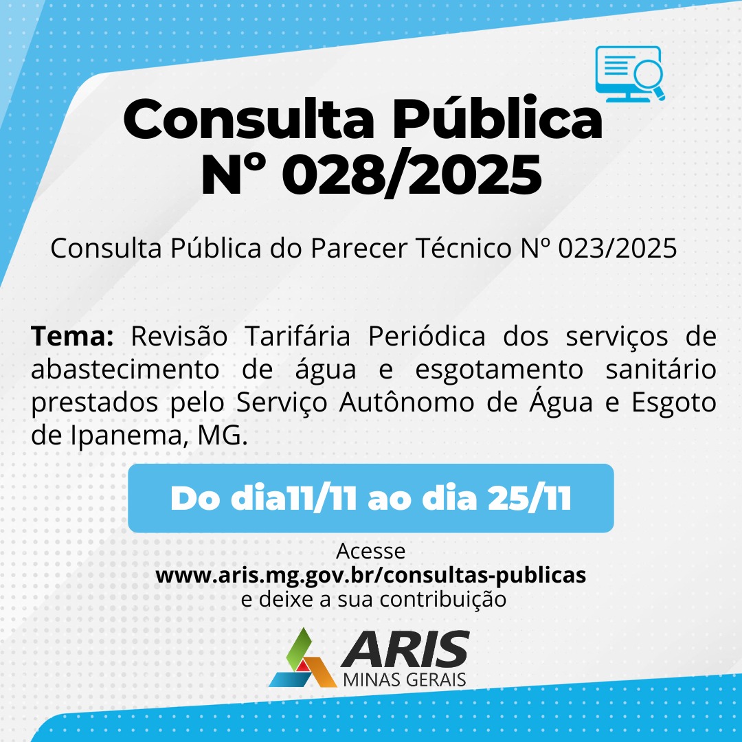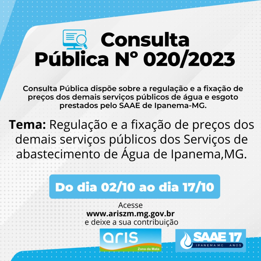 ⚠ Em cumprimento ao Art. 47 da Lei Federal 11.445 de 2007, redação dada pela Lei 14.026/2020, convidar toda a comunidade de Ipanema para participar da Consulta Pública ARIS-ZM n.º020/2023, visando apresentar a Minuta da Nota Técnico que versa sobre regulação e fixação de preços dos demais serviços públicos prestados pelo Serviço Autônomo de Água e Esgoto Saae de Ipanema disponível no Site: