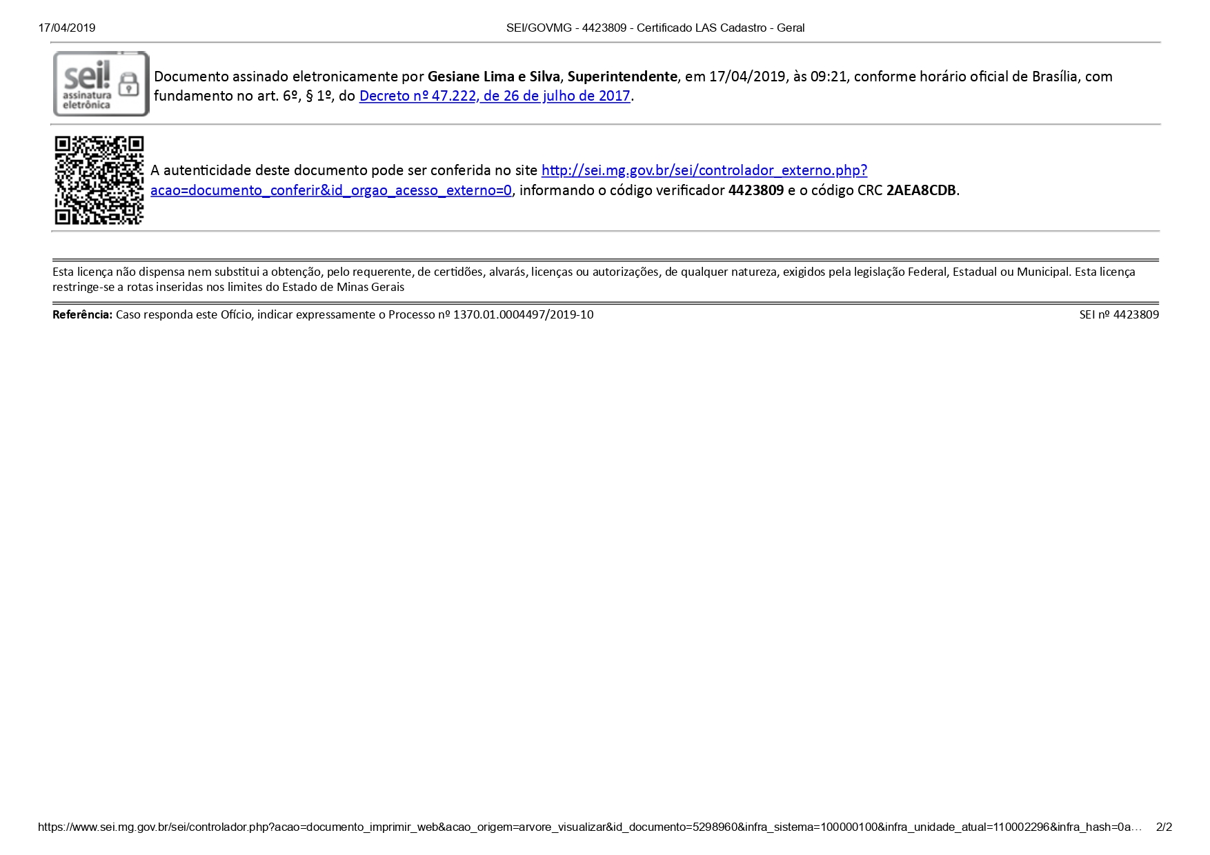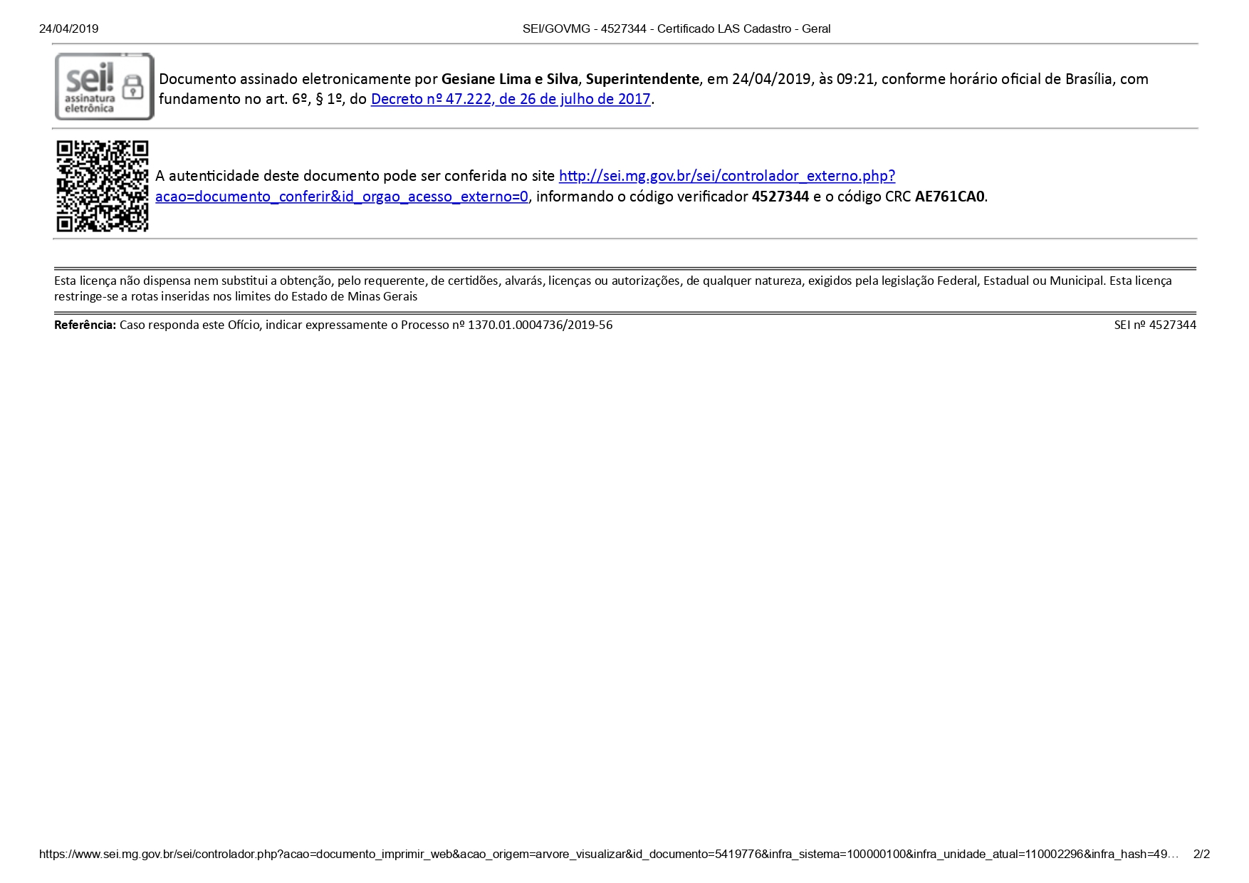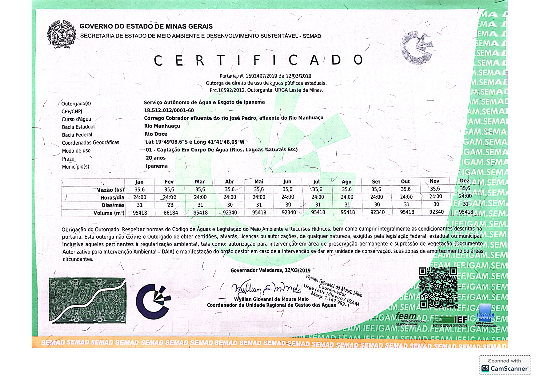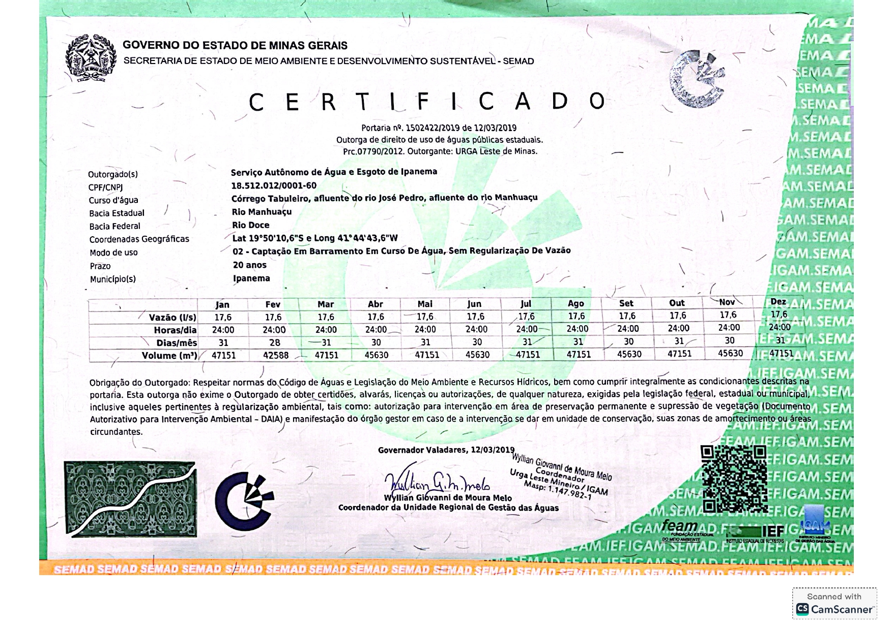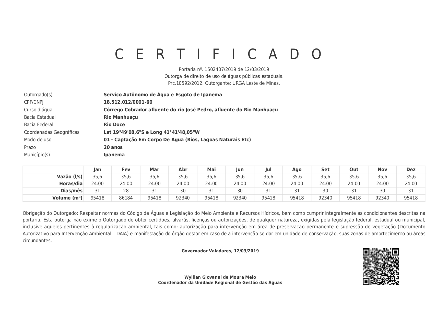 Certificado Nº55797126-2019 – SAAE Ipanema | ETA Captação Córrego Cobrador