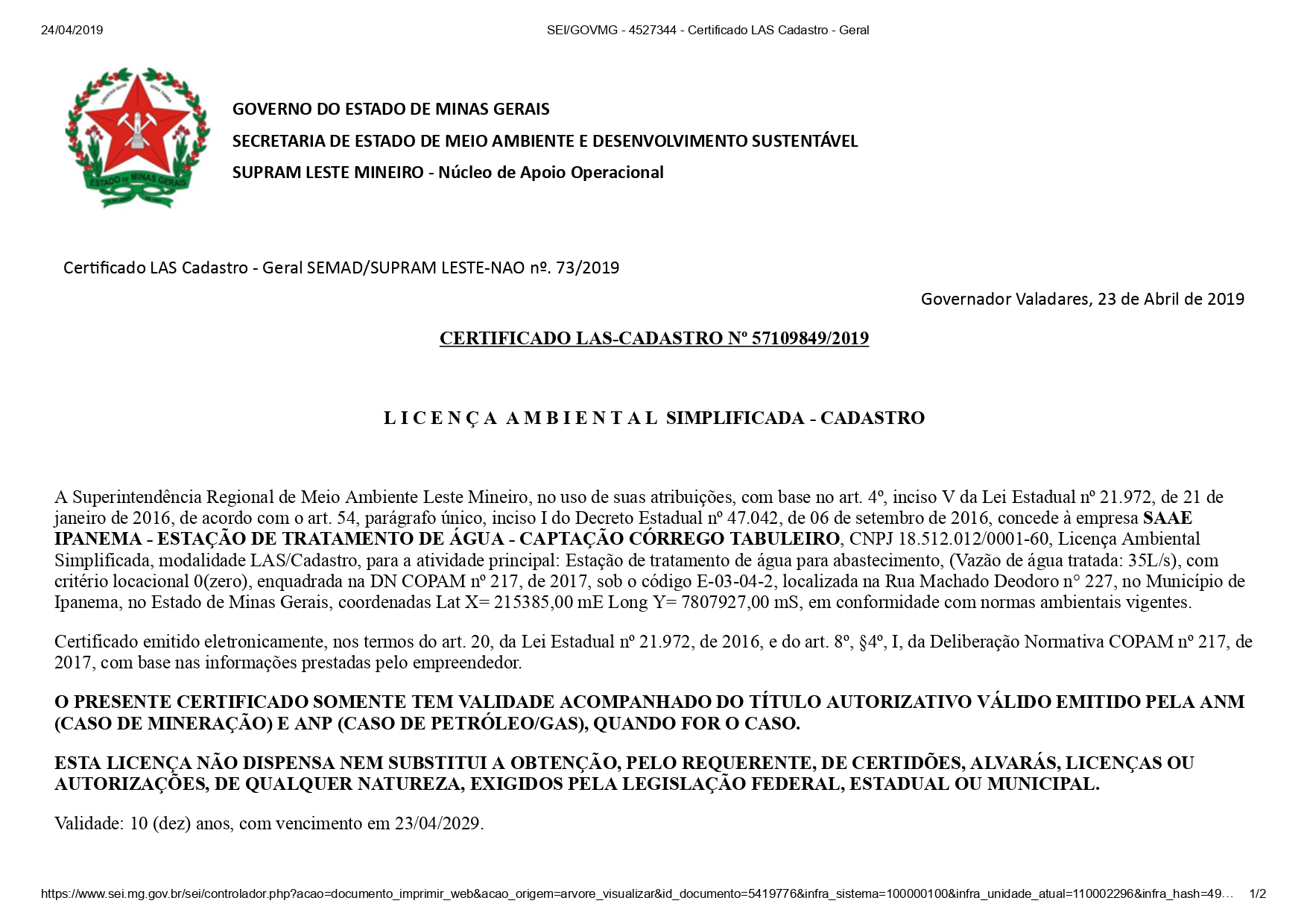 Certificado Nº 57109849-2019 – SAAE Ipanema | ETA Captação Córrego Tabuleiro